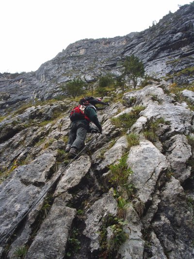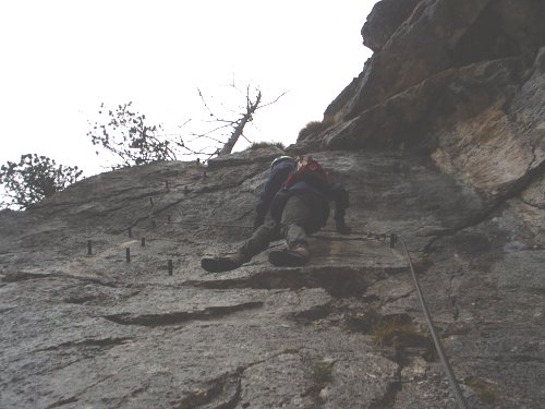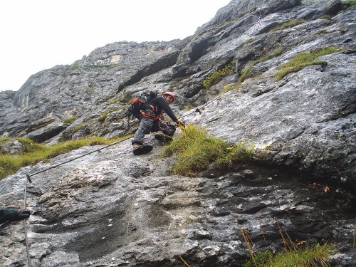 Jestli se nám lezlo první dvě hodinky špatně, zbytek cesty nebyl rozhodně lepší. Hned jak se déšť zmírnil, vyrážím do hodně uklouzaného traverzu a po 15 minutách vypadám, jak kdyby na mě někdo vylil kýbl. Vytoužený Biwak je sice již jen kousek, ale ani se tam nejdeme podívat. Začínáme trochu spěchat, neboť problémy jsou nasnadě, tím spíš když poslední lanovku v 17:00 určitě nestihneme. Nad Biwakem se nachází pekelnejch míst požehnaně.   Dochází i na tyče s možností nabodnutí,   převislý Am Igel a lahůdkovej traverz Putz Band.