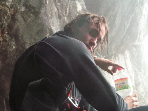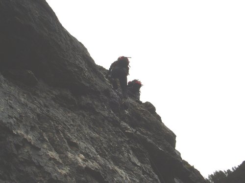 Pit věděl co říká, když slova "nedoporučuje se za deštivého počasí" vkládal do své knihy. Šplh na laně mě nebavil už na základní škole, tady jsem ho měl za chvilku plný zuby taky. Naše paměť se ukázala býti také nepříliš vyvinutou, neboť jediné, co jsme si zapamatovali, bylo místo zvané Biwak a u něho poznámku, že je asi někde v půlce stěny.