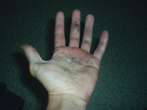 Z hlediska fyzického jsme na tom nebyli vůbec dobře. Přeci jen všechno klouže, a to všechno, co klouže, musíme vytáhnout rukama. Poslední komínek na vrchol už lezu opravdu z rezerv fyzických, o kterých jsem do této chvíle neměl ani nejmenšího zdání. Vrcholová knížka, u které si blahopřejeme k úspěchu je ale o dobrých dvacet minut šplhu níž. Takže v okamžiku, kdy si v 17:00 zasebejišťuji uši a Kája mě u toho fotí, se Martin podle jeho slov opakovaně čtyřikrát sesouvá komínem dolů, což nepříjemně pociťují zejména jeho ruce, které si už toho v cyklistických rukavicích beztak vytrpěli dost.