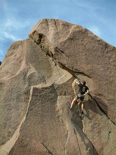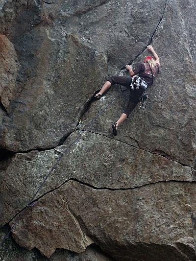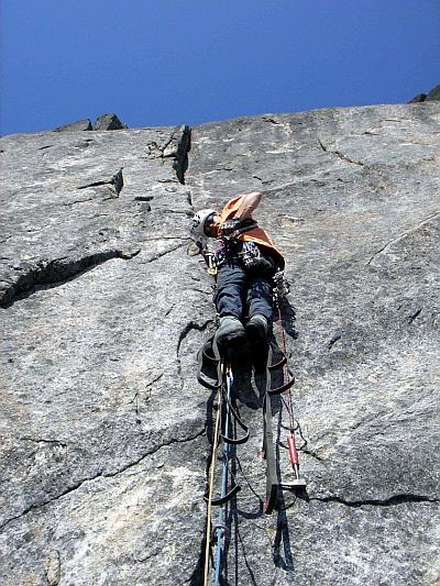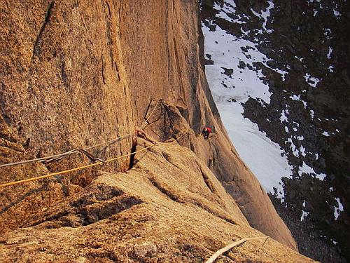 Do Freyi vlítli bez většího otálení Stoupa s Kreisikem (viz. článek na webu ČHS) a já s Johnym jsme se pustili do Bouřkového pilíře. Na rozdíl od kluků ve vedlejší cestě jsme se rozhodli, že půjdeme „na lehko“, takže jsme si nevzali portaledge, spacák, věci na vaření a haulbag tak vážil pouhých cirka čtyřicet kilo. Není nad to lézt lehkým alpským stylem… Podle nákresu jsme usoudili, že bivaky jsou na policích. První bivak pohoda, druhý bivak kolmá stěna… Po chvíli přemýšlení jsme dospěli k závěru, že Angláni měli s sebou závěsnou postel. No, nic se neděje, je kolem půlnoci, zoncna valí a my holt musíme valit taky. V následující átrojkový dýlce, která měla padesát metrů, jsme vystříleli veškerej matroš včetně toho, kterej jsme si brali s sebou jako „co kdyby“. Z dostupných informací jsme věděli, že by cesta měla jít vylízt volně. Ta možnost tu je, ovšem naše představa přelezu vzala za své charakterem jištění. Poměrně častým používaným artiklem byly birdbeaky, jedničkové skoby a mikrostoppery. Vyřešilo by to pár nýtů, ale změnilo by to poněkud charakter cesty a stejně jsme jich měli pouze pět. Cesta byla totiž udělána v ryze anglickém tradičním duchu, takže na sedmi stech metrech lezení potkáte pouze tři nýty – z toho jeden patří do Freyi, další je v komíně kvůli dobírání haulbagu a poslední je natlučen pravděpodobně omylem nebo z dlouhý chvíle, nicméně nás zachránil při slaňování…