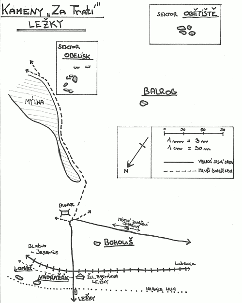 Kameny jsou roztroušeny v lese v okolí železniční zastávky Ležky, především jihovýchodně od ní. Většinou se jedná o samostatné kameny, vyjímku tvoří dva větší sektory. Sektor Městečko (Obelisk) obsahuje v současné době nejvíc vylezených boulderů, v sektoru Obětiště nejsou zatím žádné vylezené směry. Kameny se tu musí nejdříve očistit od mechu a lišejníku.