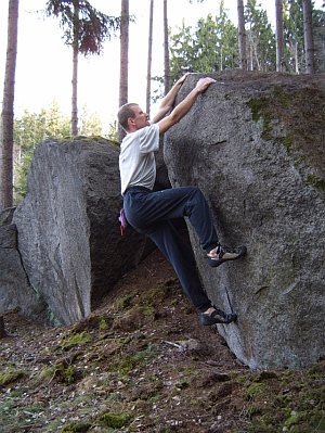 Bouldery jsou značeny malými červenými šipkami. Klasifikace je obdobná jako na Mlýnském vrchu. Upozorňuji ale na to, že většina směrů má jen jeden přelez, tudíž předpokládám, že se hodnocení cest bude ještě upravovat. I proto prosím každého, kdo si sem vyrazí zalézt, ať mi své případné připomínky sdělí. I přesto, že kameny jsou očištěné, doporučuji si s sebou vzít košťátko a kartáč na dočištění.