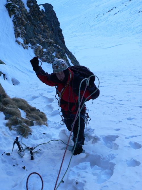 Pod nástupem je pěkná kosa. Honza leze první délku a já mezitím pěkně promrzám.Prsty nejdou cítit, ale postupně se rozehřívám a než dolezu na štand  jsem ok. Beru matroš a už to frčím další délkou. Opatrný exponovaný traverzík pod převysek, šup tam frendík jeden krok a hle stará skobka, byl bych blázen ji necvaknout, a tak dále a tak dále, štand. Honza leze,co leze, Honza řve, krapec nám na štandu promrzl. Poté co se probojoval na štand začíná pětiminutové  rozmrazování. Rukavice dolů a šup ručky do podpaží, prostě klasika. Mě mezitím, jak se později ukázalo, trochu omrzly prsty na noze, no co už, každá sranda něco stojí.