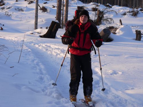 Honza tento unikátní dlouhý sjezd bravurně zvládl, lyže vyzul pouze jednou a hubu si také nerozbil. Já jsem si sjezd, který místy připomínal sjezd bobovou dráhou náležitě vychutnal a Honzu dohonil, právě když byl ve své fotografické extázy na minuloroční polomové mýtině nad Matlárama. Pak jen naházet věci do auta a hurá domů.