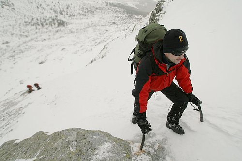 Cestou zapadáme místy až po pás. Jinak to jde. Honza si nasazuje čepici a přetahuje kapuci. Navrch ještě přidal helmu. Je to paráda. Takže ne jenom, že nevidí, on i neslyší. V první délce jsem zjistil, že to takhle nejde. Nevidět a ještě neslyšet. Honza cepíny buší do šutru jako vzteklý havíř.I práce s dvěma lany je náročnější. Nejhorší však asi bylo vlastní lezení s cepíny a mačkami. Bez citu a vizuální kontroly je takřka nemožné pro Honzu lézt skalnější partie. Ty partie bez pověstných tatranských drnů. Délku pod lávkou Szepanských jsme se otočili do doliny. Slanili jsme.