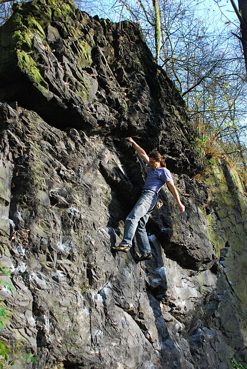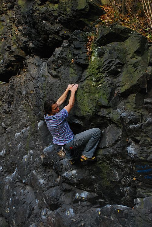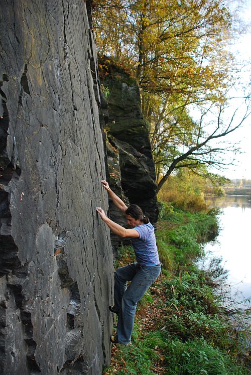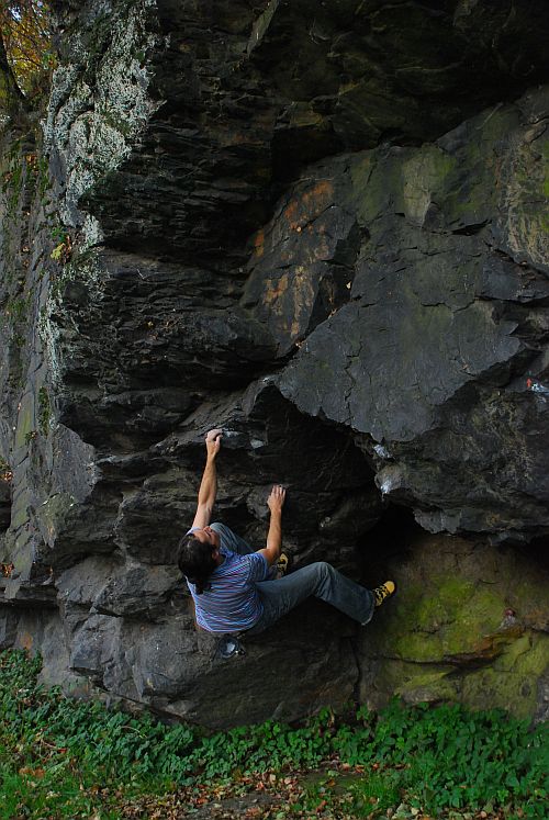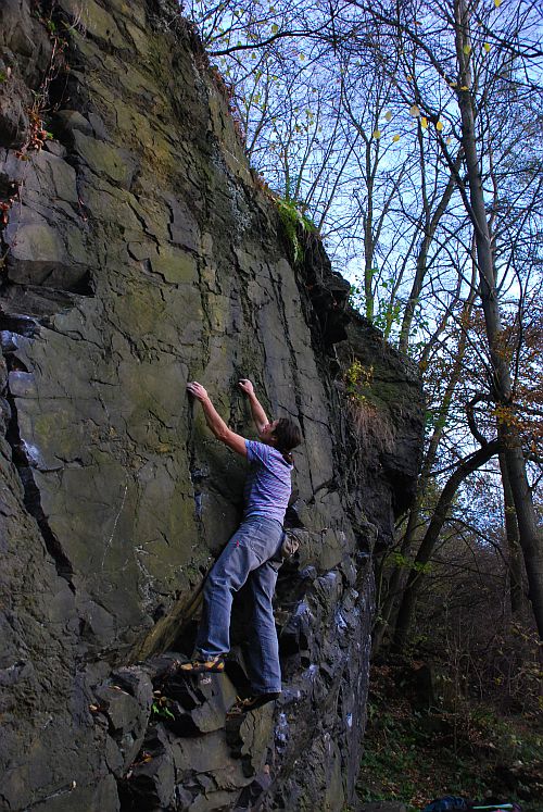 Najdete zde i oblíbený traverz a několik boulder traverzů po označených chytech.