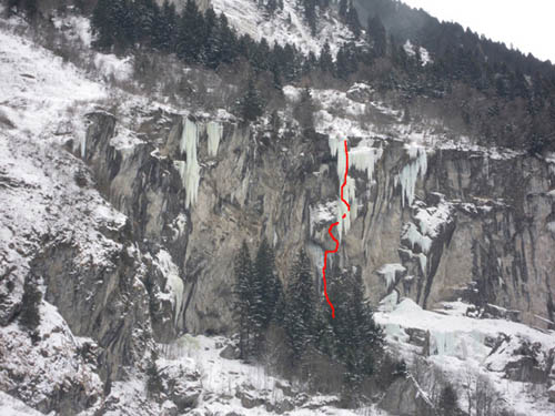 Route: Solo k nástupu cesty WI3/10m. P1: M8+, 40m, 5 nýty & 3 skoby. P2: M10, 30m, 8 nýty & 1 skoba. P3: WI6, 40m