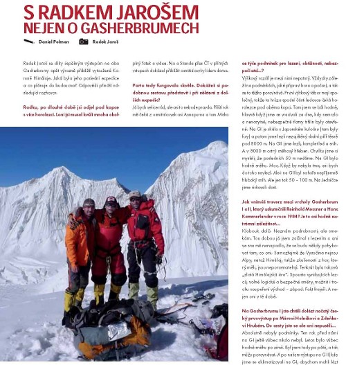 Po úspěšné expedici Double Gasherbrum 2010, během které vystoupili Petr Mašek, Radek Jaroš a Libor Uher na vrchol Gasherbrumu II a posledně dva jmenovaní i na Gasherbrum I, jsme dali prostor všem pěti účastníkům expedice, aby čtenářům sdělili své dojmy. Nejvíce otázek směřovalo na lídra expedice – Radka Jaroše. Rozhovory přinášíme na str. 20-23.