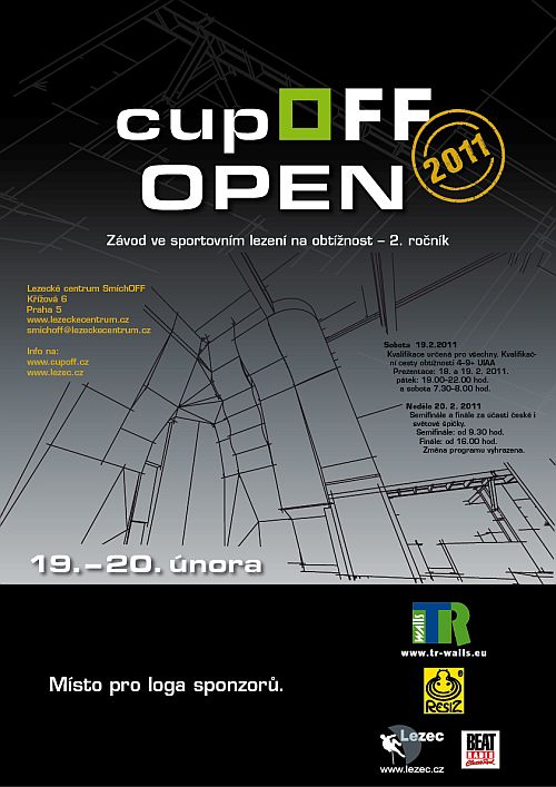 Dobrou zprávu máme pro ty, kterým se první ročník líbil. Moc toho měnit nehodláme. Sobota bude určena pro širokou lezeckou veřejnost. Poleze se flash na cestách obtížnosti 4 – 9+ UIAA. Takže si zaleze opravdu každý. V neděli proběhne semifinále a finále, do kterého postoupí nejlepší ze soboty a nasazení závodníci ze světové špičky. Plné znění pravidel, postupový klíč, propozice a další informace naleznete na www.cupoff.cz. Rád bych upozornil na dvě změny oproti ročníku 2010. Ve snaze co možná nejvíce urychlit průběh závodu, jsme se rozhodli umožnit přihlášení do závodu již v pátek od 19.00 - 22.00 hod. a v sobotu od 7.30 – 8.00 hod. Druhá a podstatnější změna se týká zdvojení některých kvalifikačních cest.  Po zkušenostech s loňským ročníkem jsme se rozhodli zdvojit cesty obtížnosti 6, 7 a 8- UIAA. U těchto obtížností bude cesta A a cesta B (to jsme zkušebně zavedli již v minulém ročníku u cest 6 a 7). Změna bude spočívat v tom, že pokud si závodník vybere cestu B a nevyleze ji, tak bude mít na konci závodu možnost opravného pokusu na cestě A. Tento opravný pokus však bude sloužit pouze k získání bodů do celkového pořadí. Pokud tedy závodník vyleze cestu A v opravném pokusu TOP, tak již nepostupuje na cestu s vyšší obtížností a končí s výsledkem TOP na cestě A. Toto poněkud komplikované pravidlo zavádíme proto, že chceme, aby sobotní závod byl plnohodnotným závodem pro všechny a ne pouze kvalifikací, která má určit xy postupujících do semifinále.  Jsme přesvědčeni, že každý závodník by měl znát své umístění v závodu s maximální přesností.