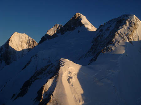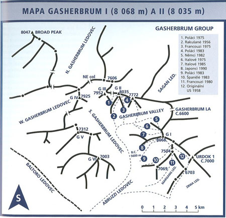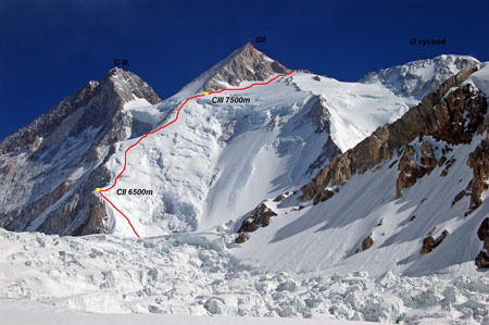 Z leva vidíte těžko dostupný “průserový„ kopec G4 7925m. Hned další problém v podobě G3 7950m, který má míň výstupů než prstů na rukách. Dělal jsem na něj pokus o prvovýstup JV stěnou s Honzou Doudlebským v roce 2007 a dolezli do výšky 7400m, kde jsme dostali od Alláha za vyučenou. Pak následuje G2 80345m, nejčastěji dosažený vrchol ze skupiny Gasherbrumů. Není výjimkou v příznivém létě i přes sto výstupů na vršek za sezonu. Poslední viditelný vršek je 7772 metrový hřeben s označením jako Gasherbrum východní, spadající do sedla Gasherbrum La (6400m) mezi GII a GI.