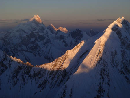 Pohled přes G5 7133m na zapadající slunce, které olizuje poslední metry Masherbrumu 7821m. Jen pár šťastlivců stálo na jeho vrcholu.