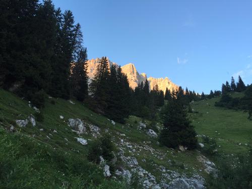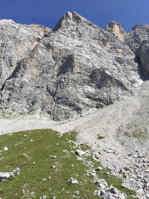 2. Předpokládám, že vyjíždíte na předpověď, a máte tedy hezké počasí. Alpská krajina v Rätikonu je prostě dokonalá, a tak i cca. dvouhodinový nástup na úpatí Drusenfluhu je docela stravitelný. Byť se to opticky zdá nemožné, je opravdu lepší jít směrem na sedlo Schweizertor a potom po vrstevnici až k Drusenfluhu. Stěna Drusenfluhu je vysoká od samotného úpatí skoro 700 m, ale při nástupu do cesty Mangold spodní členitou partii stěny obejdete zprava a potom se pod kompaktní 500m stěnu vrátíte cca 200m traverzem. Najít nástup chvilku zabere, ale podle průvodce to docela sedí a na nástupu jsou dva nýty.