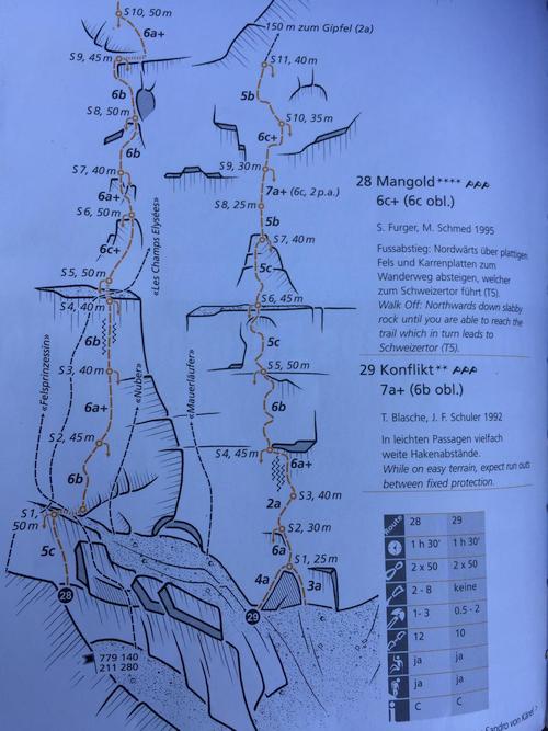 3. Cesta má 10 délek dlouhých až 55 m, takže 500 metrů odpovídá. Je to cesta novější generace, takže 2 nýty na štandech a postupové nýty jsou dány tak, abyste se nezabili a nezabloudili. Ale pozor, rozhodně "kein plezir". Cesta vede po stejných nýtech, občas se křižuje s jinými cestami, ale udržet směr není problém, ale někdy je potřeba se dobře rozhlédnout. Autoři směr cesty vytyčili tak, aby střed stěny logicky prostupovala kompaktními pilíři a kolmými hladkými plotnami v pevné skále.