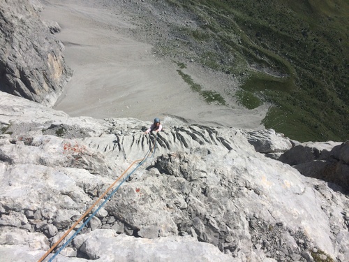 8. Sestup je na sever směrem k sedlu Schweizertor, je orientačně i technicky docela náročný, ale horské prostředí je nádherné a kochání se doporučuje. I když po dlouhém lezení jsou endorfiny vyplaveny a vám by se možná  líbila i bouřka. Orientaci ulehčuje spousta mužíků, ty nejoriginálnější jsou samozřejmě ode mne. Dle průvodce je slanění možné, ale vybrali jsme klasický sestup, slanění bych vybral pouze v případě nouze.