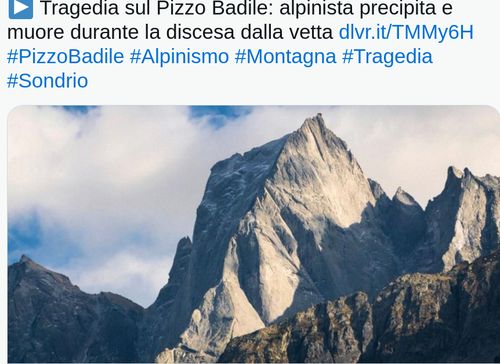 Český horolezec zahynul ve středu při sestupu z Piz Badile (3308 m) v Alpách na švýcarsko-italské hranici. Informovala o tom včera obecná média. Devětačtyřicetiletý Čech se zřítil během slaňování severní hranou poté, co spolu s lezeckým partnerem přenocovali ve vrcholové bivakovací boudě, doplnil dnes web Horydoly.cz. ... celý článek