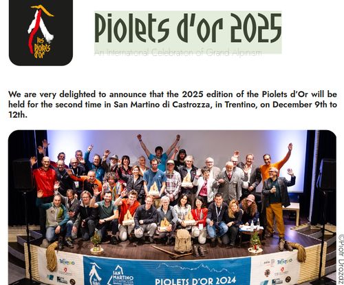 Letošní slavnostní vyhlášení nejlepších horolezeckých výstupů na ocenění Piolets d'Or 2025 za rok 2024 bude 9.-12. prosince, a to stejně jako loni v Dolomitech v horském středisku San Martino di Castrozza v italském Trentinu. ... celý článek